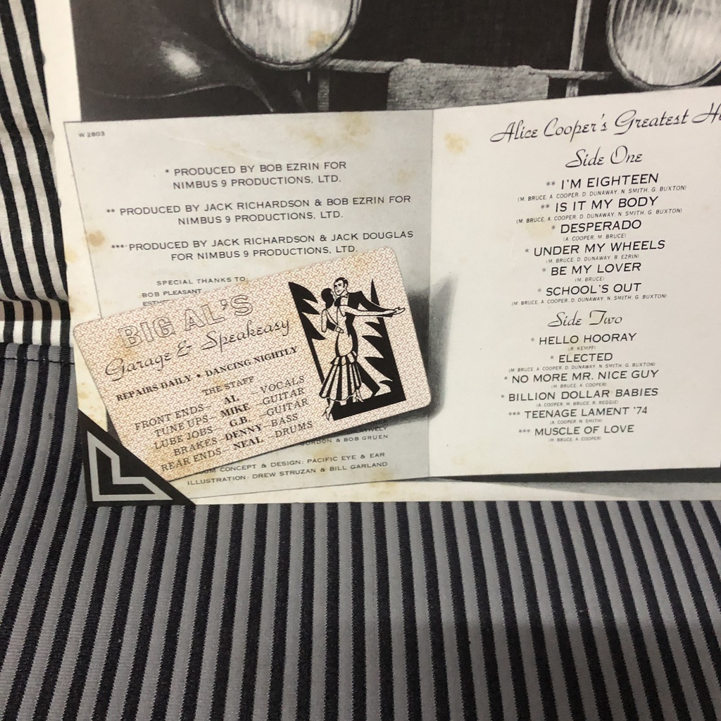 Alice Cooper – Alice Cooper's Greatest Hits álbum lançado em 1974 no Japão, disco sem nenhum arranhão ou avaria, encarte com letras e notas em inglês e japonês( encarte com marca amarelada de tempo), capa com Obi em excelente estado de conservação.
