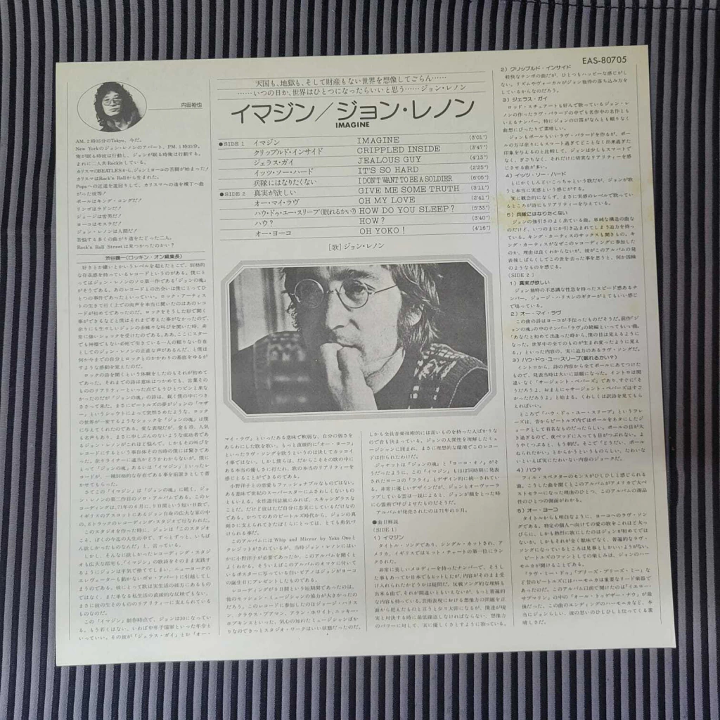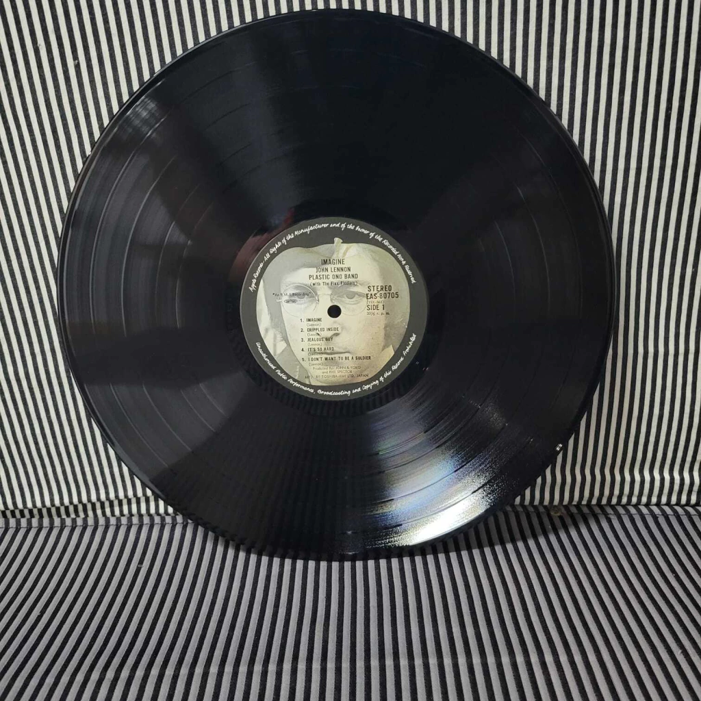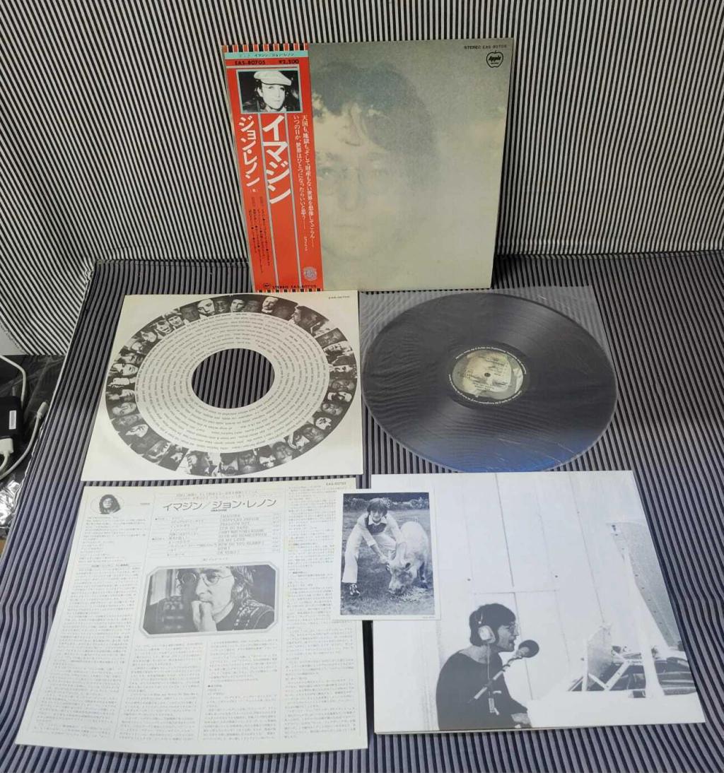 John Lennon – Imagine Álbum de reedição lançado no Japão em 1977, disco em excelente estado, acompanha capa interna recortada personalizada com letras e créditos, acompanha pôster, foto, encarte com a letra da música em japonês e inglês, capa com obi em excelente estado de conservação.
