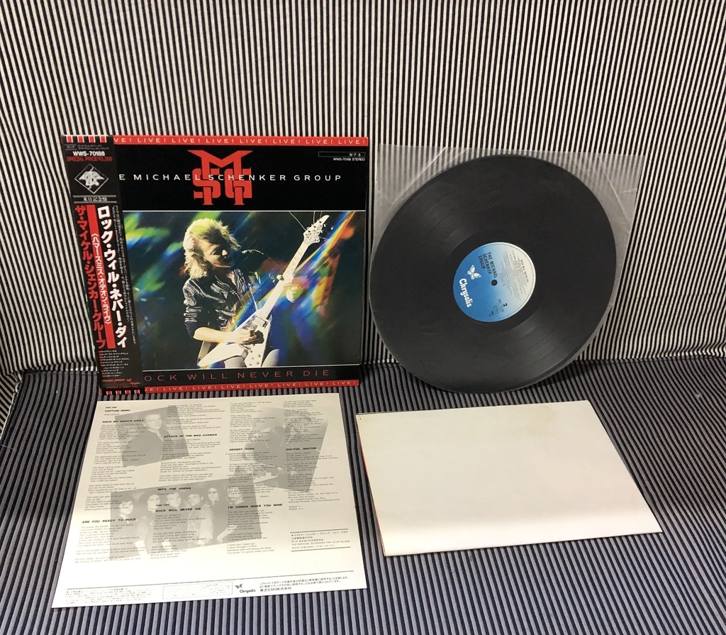 The Michael Schenker Group – Rock Will Never Die álbum lançado em 1984 no Japão, disco sem nenhum arranhão ou avaria, encarte com letras e notas em inglês e japonês, pôster, capa com Obi em excelente estado de conservação.