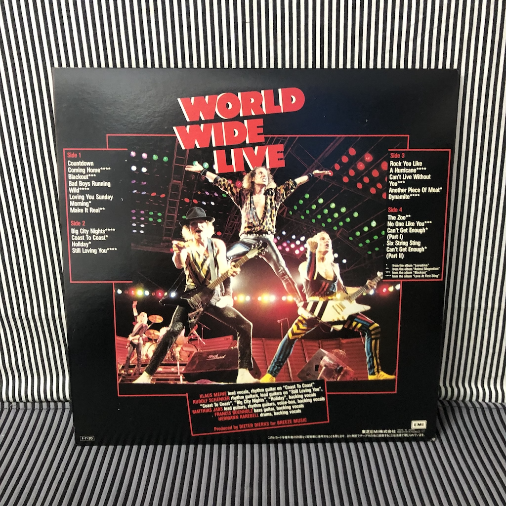 Scorpions – World Wide Live álbum lançado em 1985, disco duplo sem nenhum arranhão ou avaria, capa interna com arte, encarte com lançamentos da época, encarte com letras e notas em inglês e japonês, pôster, capa Gatefold com Obi em excelente estado de conservação.